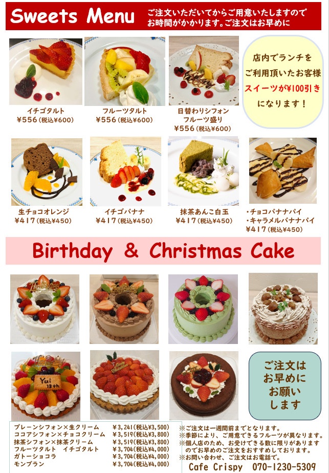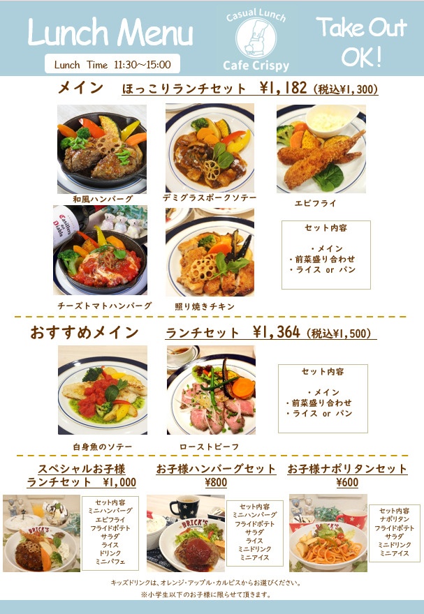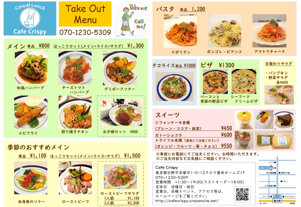 11:30~21:00※事前にお電話にてご注文承ります。お時間をいただきます。お気軽にご相談くださいませ。※メニュー画像をタップで拡大できます。お使いの機種によってできない場合もございますのでご了承ください。